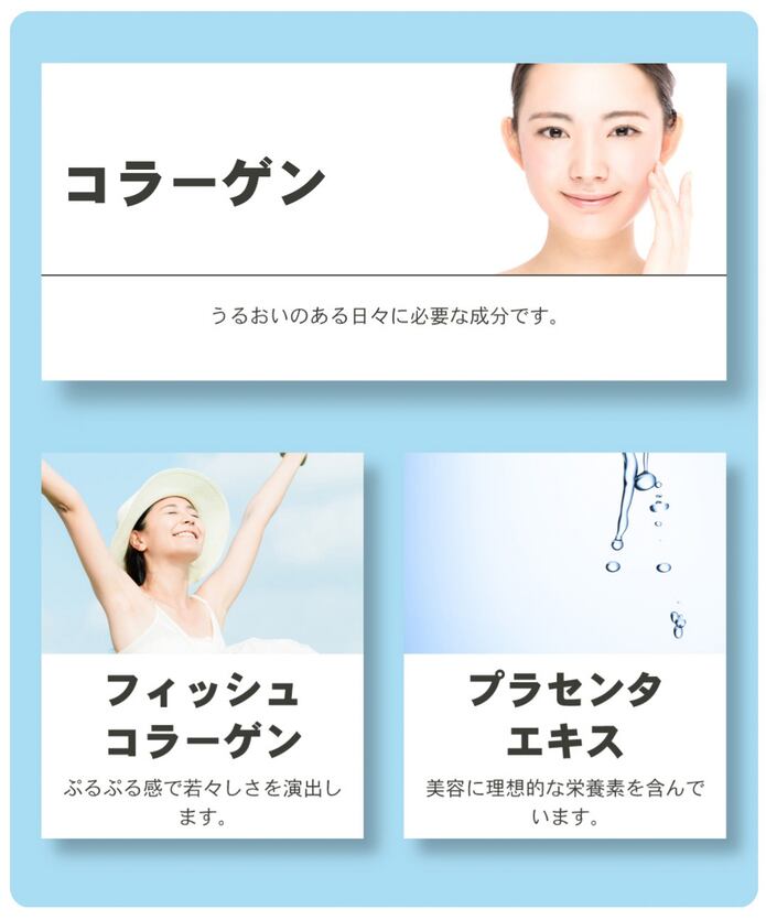 フィッシュコラーゲン、プラセンタエキス、ビタミンC、イソマルトオリゴ糖、ローヤルゼリーエキス、L-シスチン、